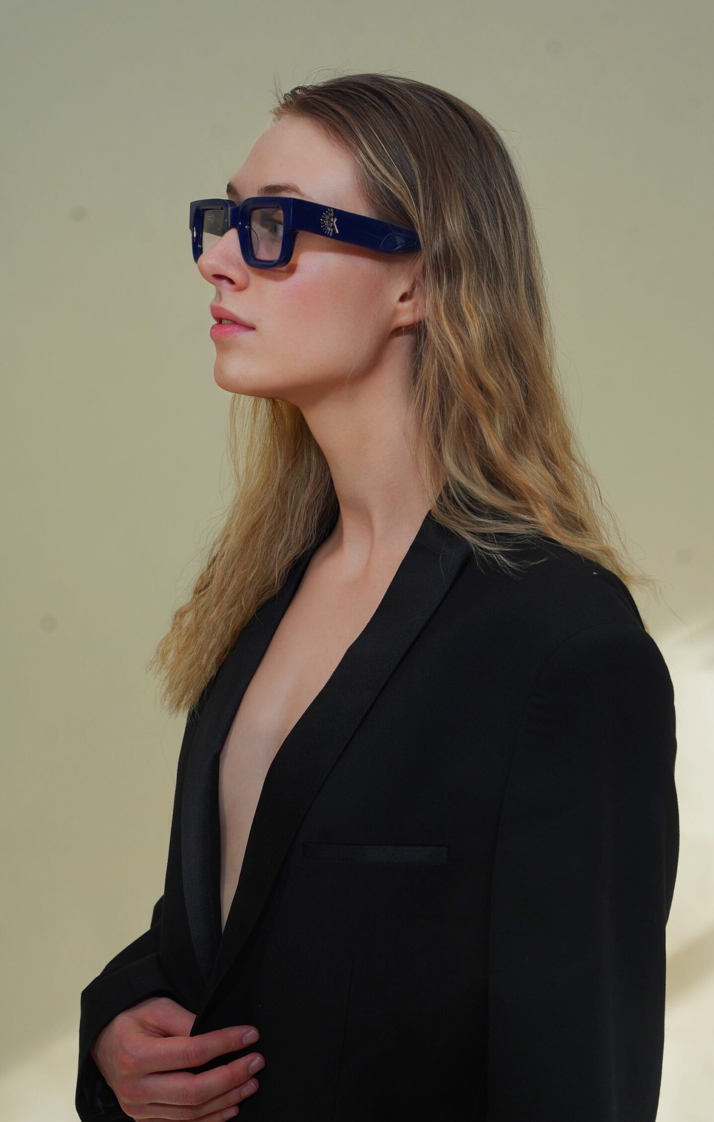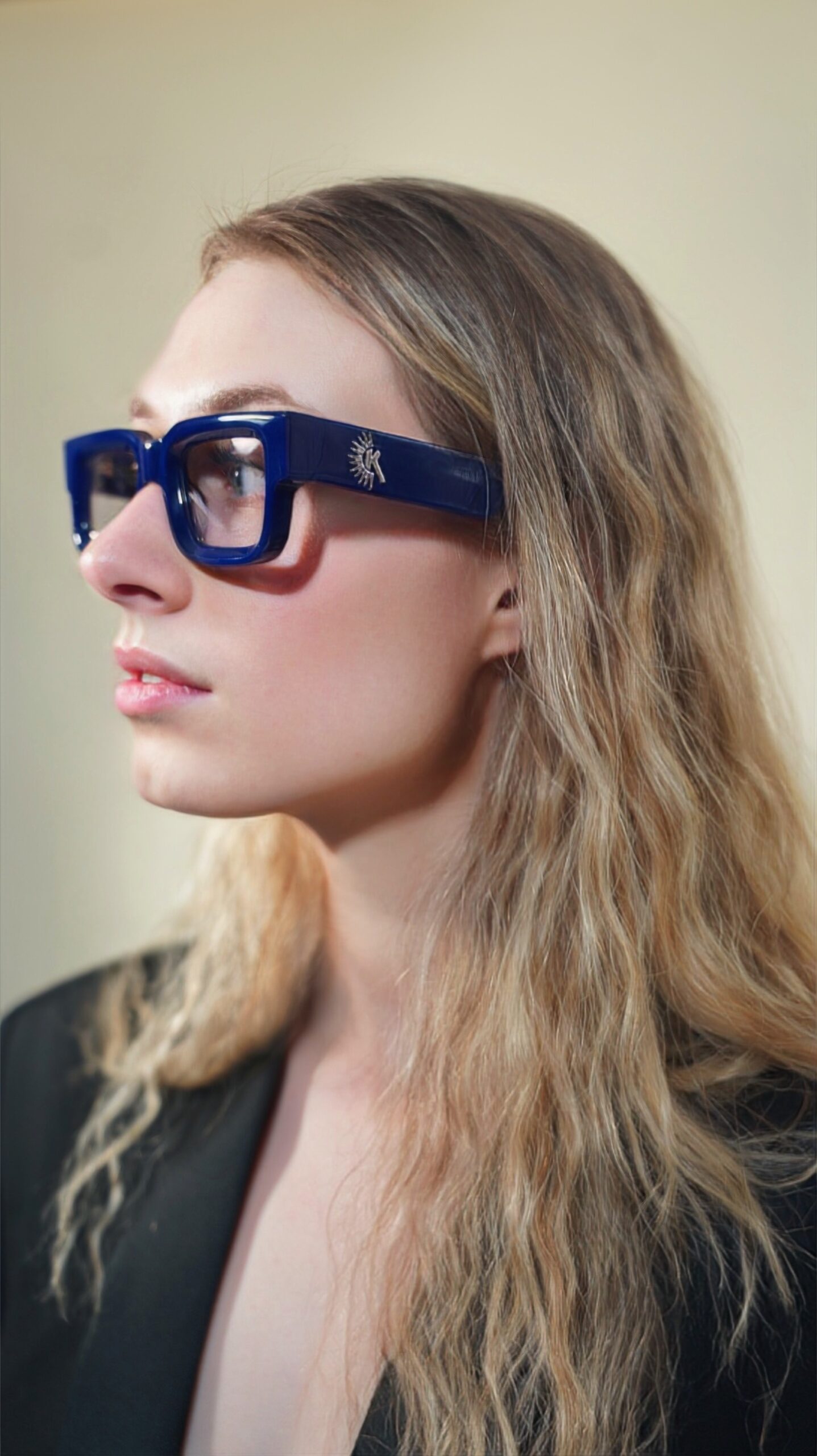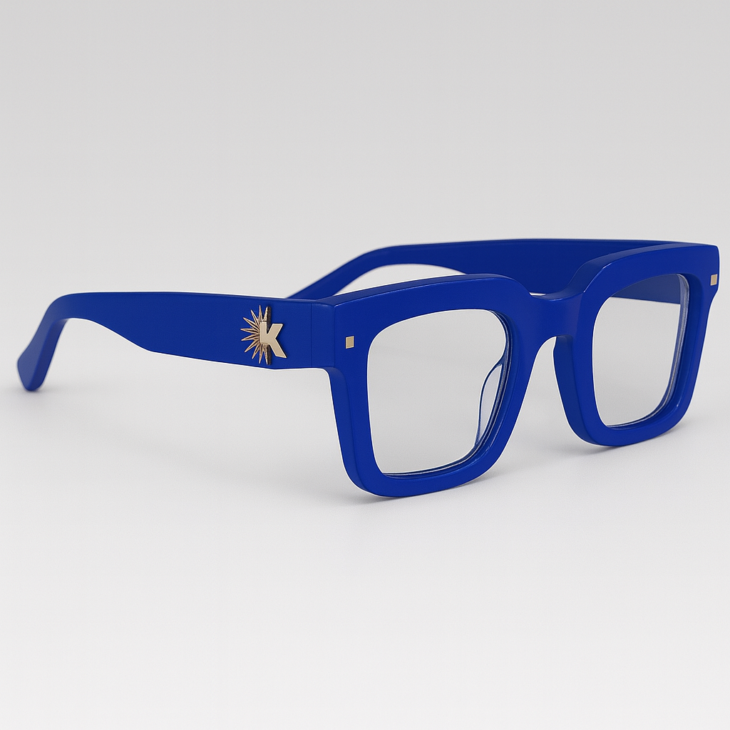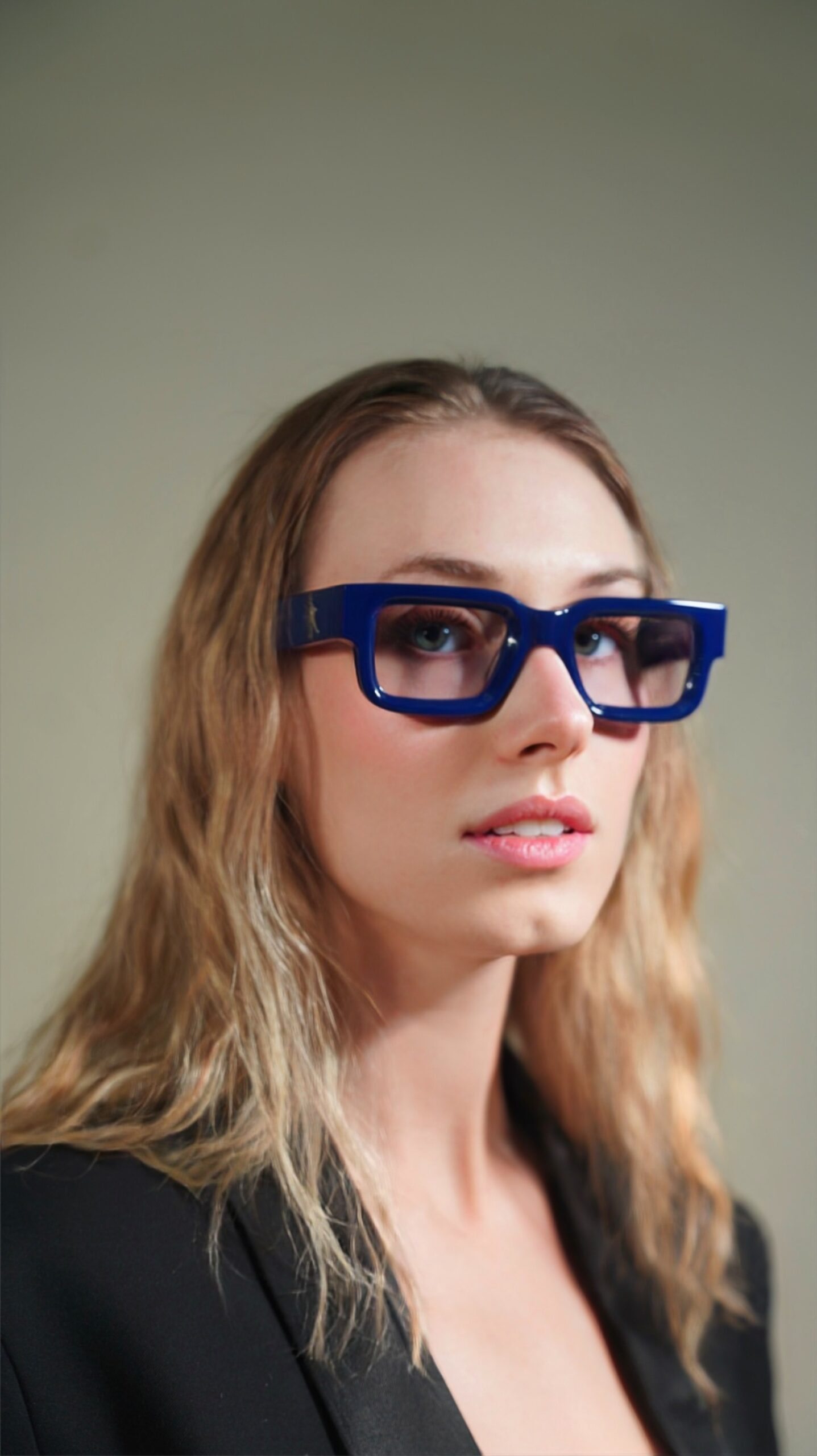A classical square frame made from durable acetate material with a high-quality gloss finish. Cerulean blue color with a silver monogram.